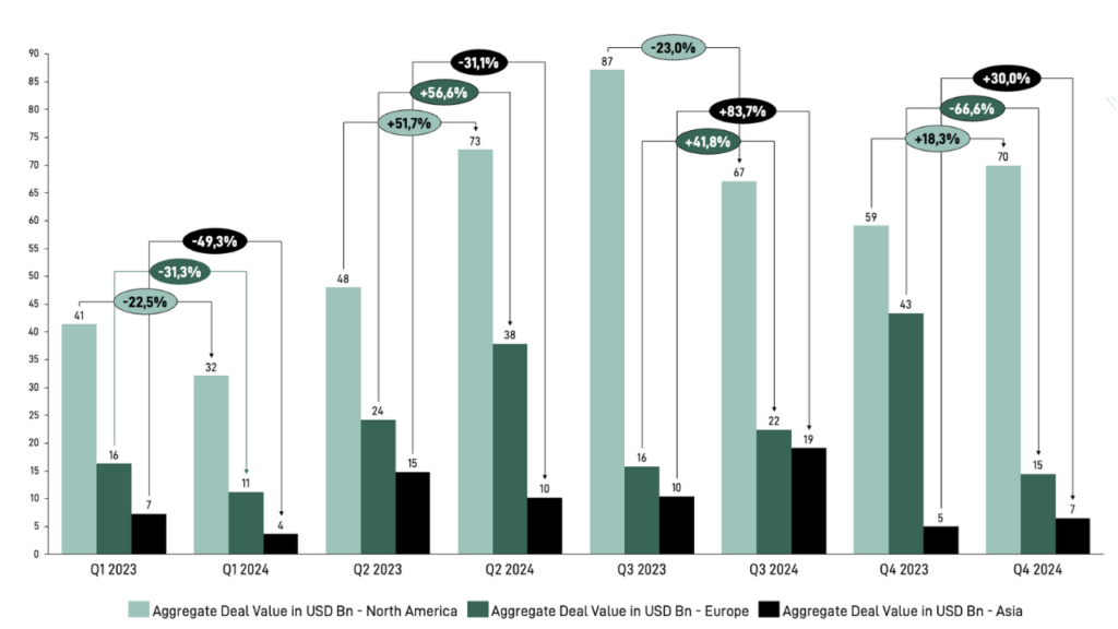 Despite regional and quarterly fluctuations, aggregate deal value tells a different story. A quarterly comparison between 2023 and 2024 reveals significant surges in deal value in certain quarters.