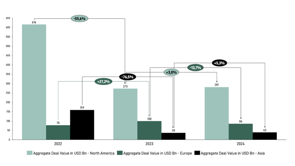 In North America, the increase in both deal volume and value can be attributed to strong economic fundamentals, a more favorable cost of capital, and high investor liquidity, all of which contributed to the resurgence of big-tech deals in 2024.