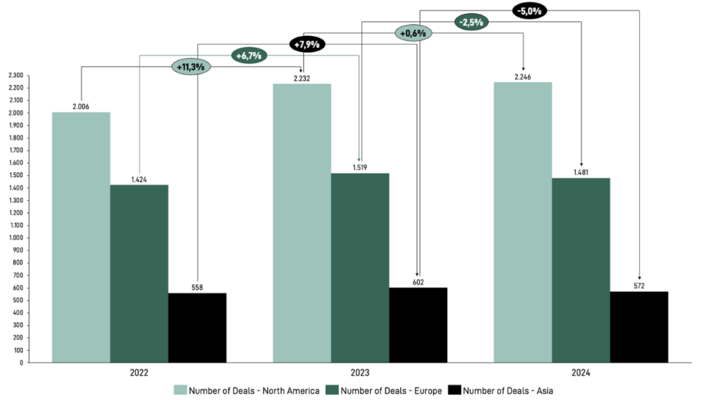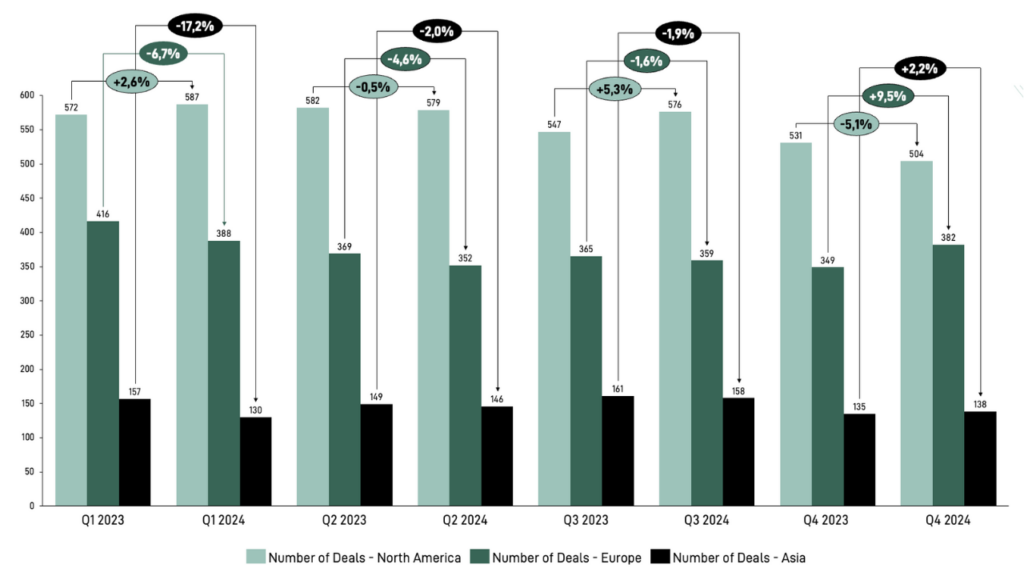 When analyzing tech M&A activity in 2024 compared to 2023, despite regional and quarterly fluctuations, one clear trend emerges: deal volume has declined.